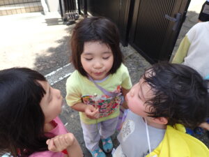 あかぐみは、新クラスになって初めての散歩。はなぐみ、そらぐみのおにいさんおねえさんに手をつないでもらい、楽しく歩いていました。