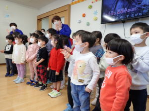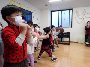 緊張もほぐれ、元気よく“やきいもグーチーパー”と“もちつき”を歌いました。