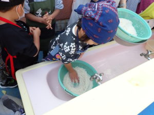 お米を研いで羽釜に集めます。一粒一粒大切に☆