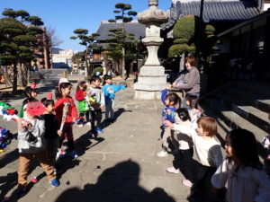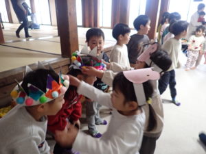節分の日に来てくれた、はなぐみ鬼は、うさぎぐみが投げた花紙の柔らかい豆が当たると、