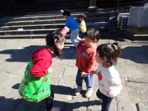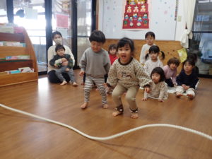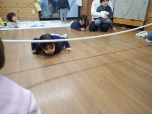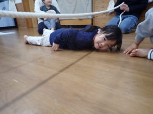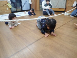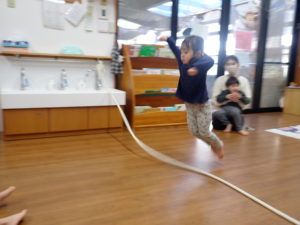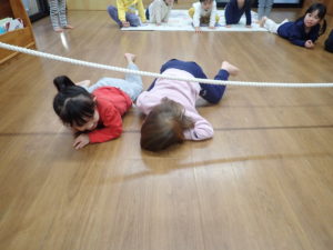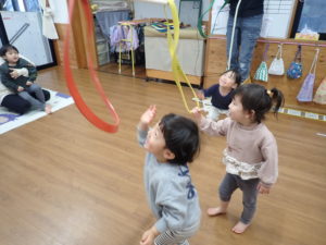 ラバーフープを使った運動遊びも元気いっぱい楽しみました。