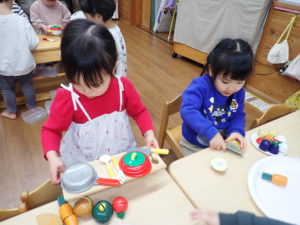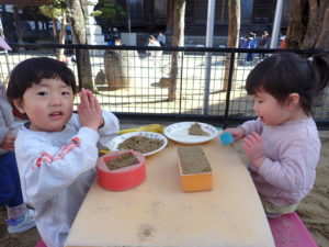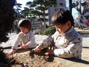 園庭の砂や石は、“今日の夕ご飯” “お薬” など、見立て遊びを豊かに広げてくれます。