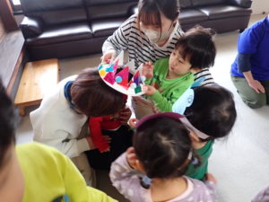 たくさん遊んでくれたはなぐみさんのお別れ会では、冠のプレゼントをしました。