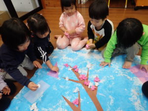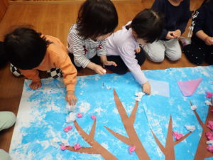 園庭の桜が咲き始めた頃、みんなで桜の花を表現しました。花紙を丸めて、自由に貼っていきます。