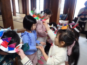 節分の日に来てくれた、はなぐみ鬼は、うさぎぐみが投げた花紙の柔らかい豆が当たると、