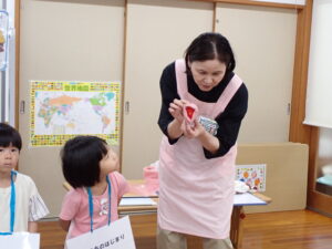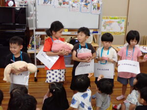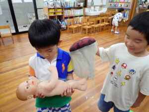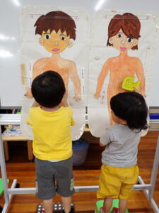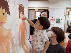 大切なプライベートゾーンについて、「なんて言ってるかな?」の質問に“ちん・・・”と言いかけて止める子もいました。きっと人前で言ってはいけないと考えたのでしょう。