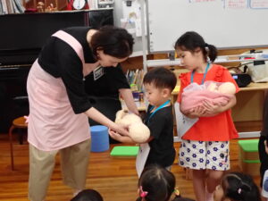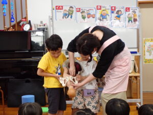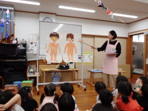 今日は、去年の全園児保護者会②でお世話になった助産師の森川寿和美先生にお越しいただいて、はな・そら・あかぐみの子どもたちに自分たちの大切な体についてお話をしていただきました。