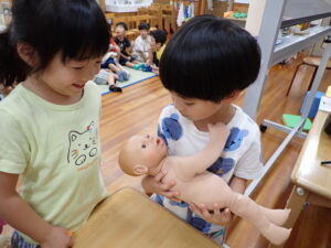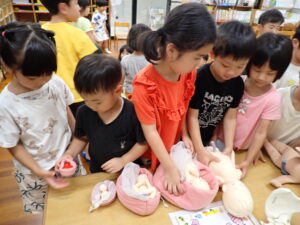 「どっちが男の子でどっちが女の子?」の質問には、“髪が長いからこっちが女の子。短いから男の子。”という声があり、先生から「髪の毛が長い男の子だっているし、短い女の子だっているよね。好きにしていいんだよ。」というお話をしてもらいました。