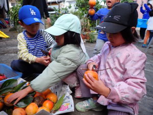 色づいて綺麗な柿の葉を拾い、“そらぐみさんに葉っぱを持って帰ってあげよう”とそらぐみへの葉を集めている子もいました。