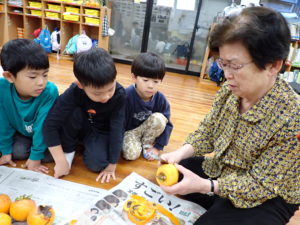 テラスに柿を吊るしています。昨年は気温が高く干し柿がうまくできなかったのですが、今年はどうでしょうか?子どもたちと柿の変化を見守ります。