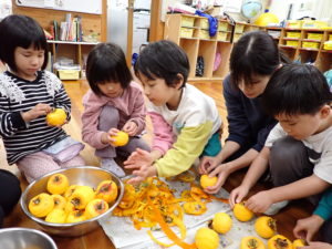 帰園後は、皮を剥いて干し柿にする準備をしました。
