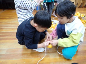 子どもたちも、葉っぱをとる手伝いや紐に柿をつるす手伝いをしてくれました。