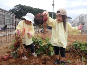帰りのバスでは、「掘った芋をどうやって食べようか」「大きいお芋が掘れて楽しかった~」等と話し、それぞれが満足した様子でした。