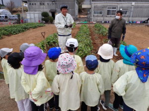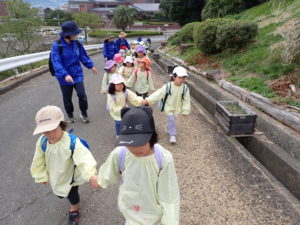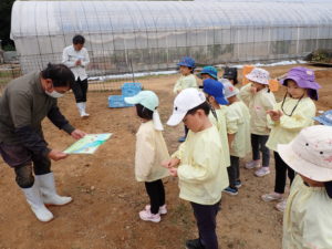 あかぐみは、はなぐみ・そらぐみのお兄ちゃんお姉ちゃんに手をつないでもらい畑まで行きました。