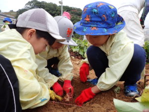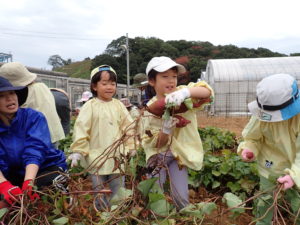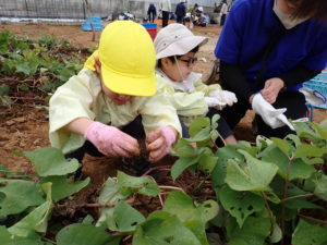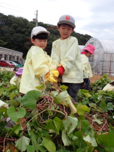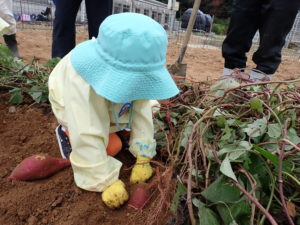 スコップではなく、軍手をつけた自分の手で、芋のつるを引っ張ったり、土を掘り返したりして芋掘りをしました。