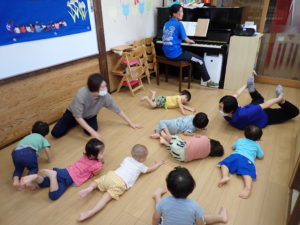 お部屋では、ピアノの音に合わせて身体を動かしています。♪もしもしかめよー かめさんポーズ!!