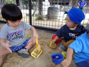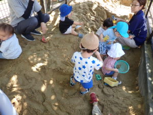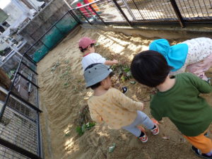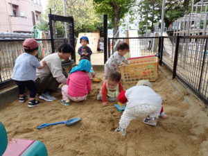 暖かい日差しを感じながら、園庭でそれぞれ好きな遊びを楽しむ子どもたち。