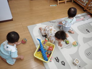音がなる玩具、転がるボールを目で追いながら身体を動かして楽しんでいます。