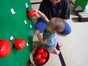 お寺で運動会あそびをして楽しみました。箱から出ている綱を引っ張ったり、りんごを木にかけたり取ったり、