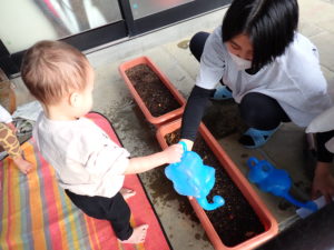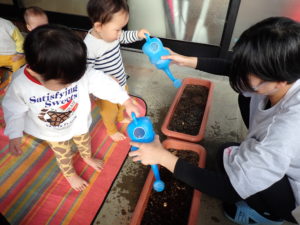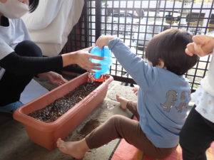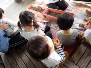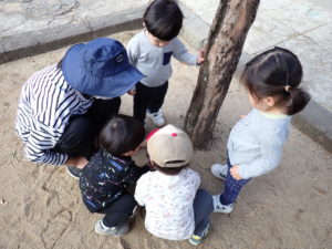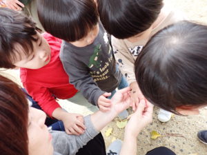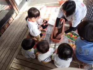 球根を握ってじっくり観察、、興味津々の子どもたちです!
