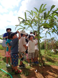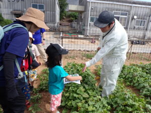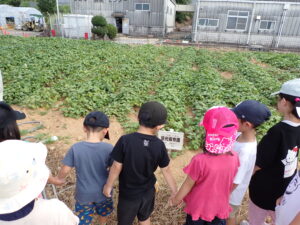 芋畑だけでなく、いろいろな植物の観察もさせていただきました。芋掘り遠足に期待が膨らむ子どもたちです。