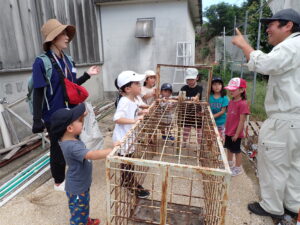 謎の檻があり「これは何ですか?」と子どもたちは興味津々。6月にイノシシが檻に入っていた話を聞くことができました。