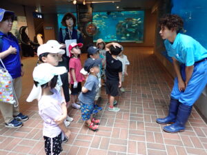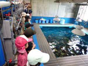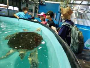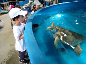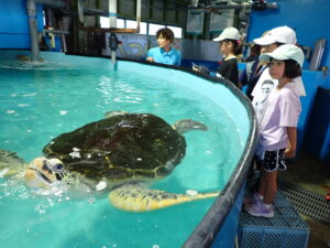 最後は展示されていないウミガメを見せてもらいました。アカウミガメとアオウミガメが大きな水槽で泳いでいました。