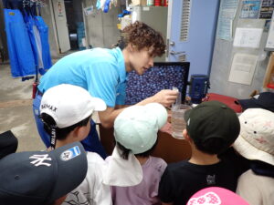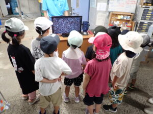 魚のエサになるブラインシュリンプという小さい生物を顕微鏡で拡大して見せてもらいました。塩湖に生息している生物だそうです。