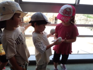 ↑園の花壇でぐんぐん伸びてきた植物が芋の葉と似ていることに疑問を感じていた子どもたち。「写真に撮って農業センターの方に聞いてみよう!」と話し合ったようで、実際に尋ねてみました。